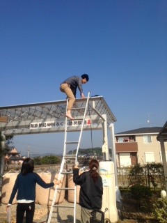 その中でも本店・店長のT氏が高所恐怖症にも関わらず、なんと!展示してある三協アルミのMシェードの上に上がり、高圧洗浄機を用いて屋根テラスのポリカ材を清掃しました!