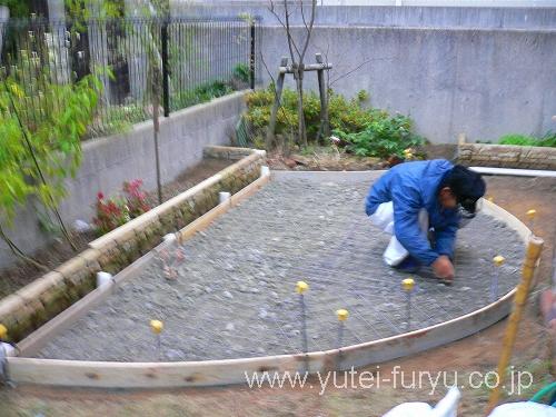 石貼り&洗い出しテラスの形を木枠でつくり、メッシュ筋を敷いている最中です。