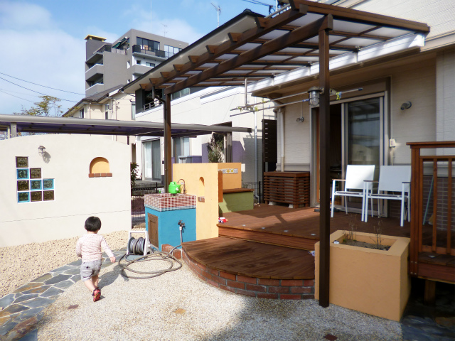 隠れ砂場もあります!ウッドデッキも広々ととってるので、お部屋からもSちゃんは裸足でガンガン走り回っています。
