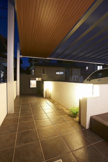 アプローチとカースペースを一体化した空間に、またカーポートとしてだけでなく、おしゃれなテラスとしても利用できます。