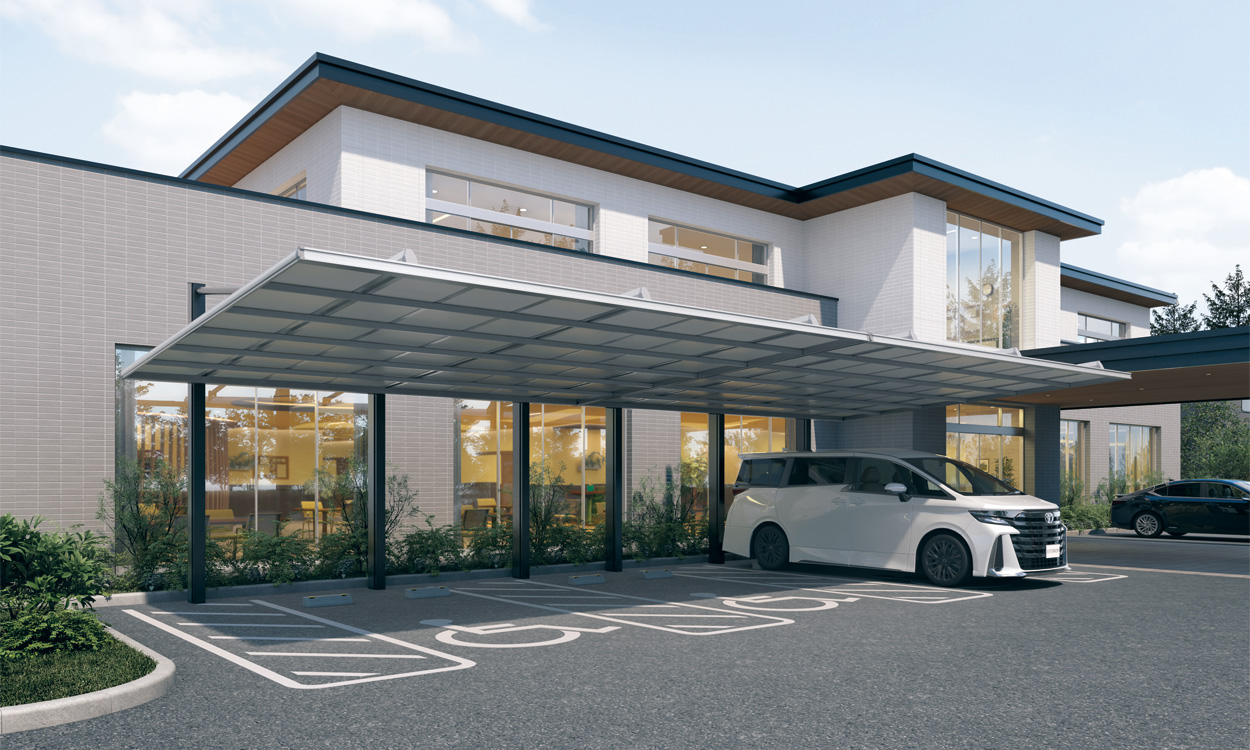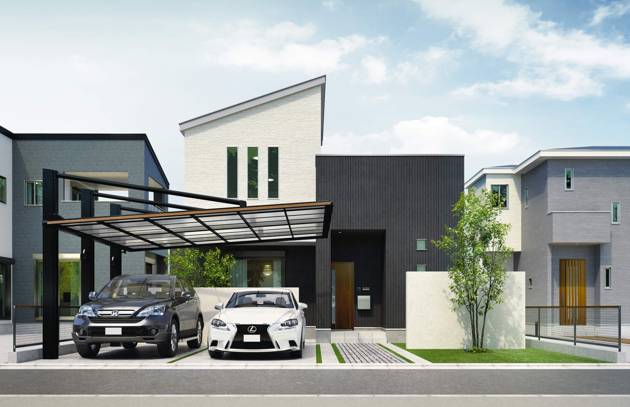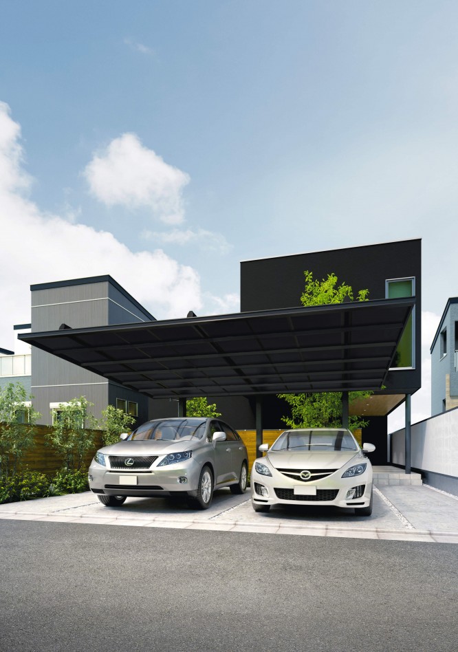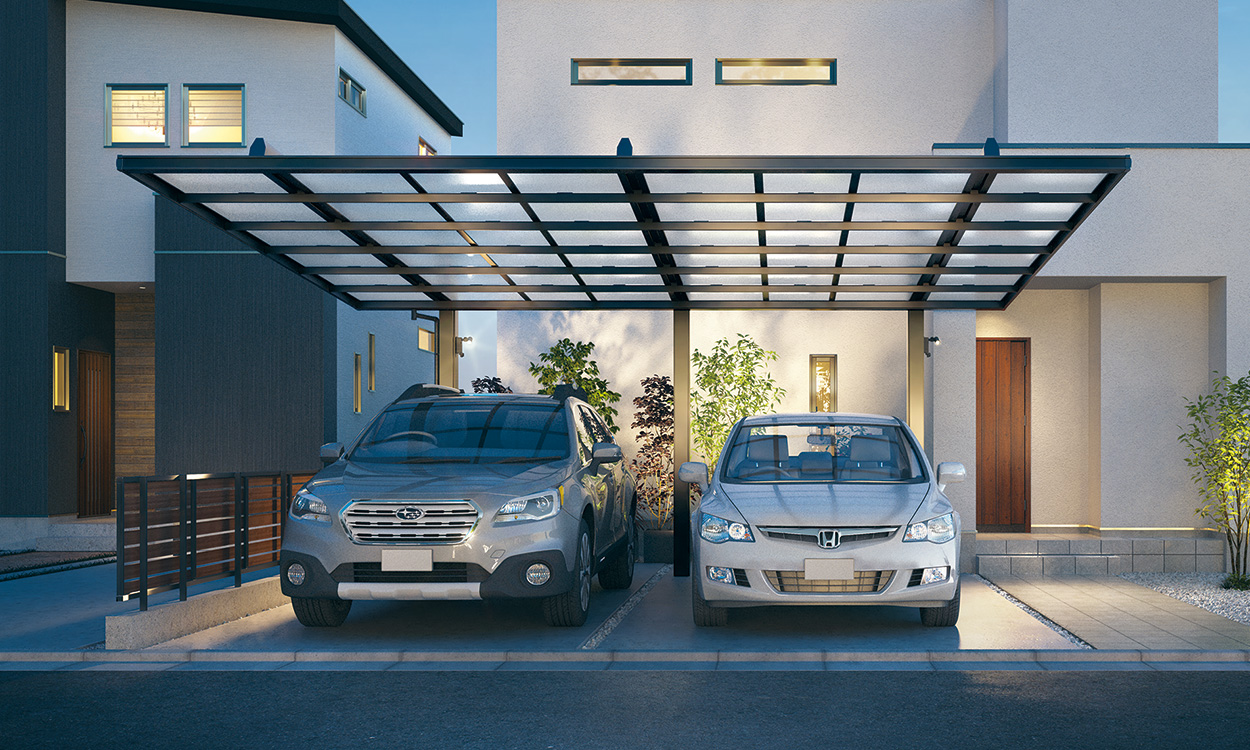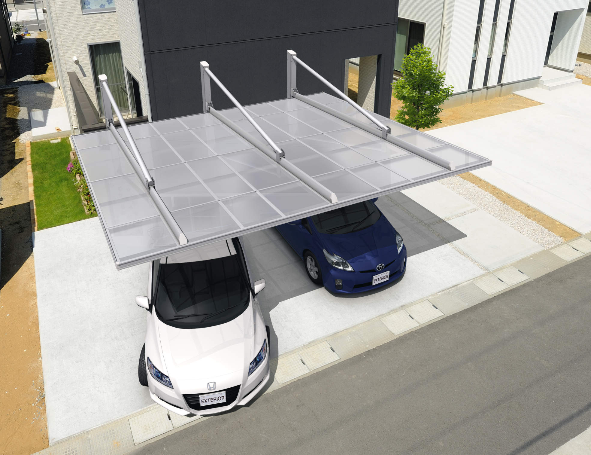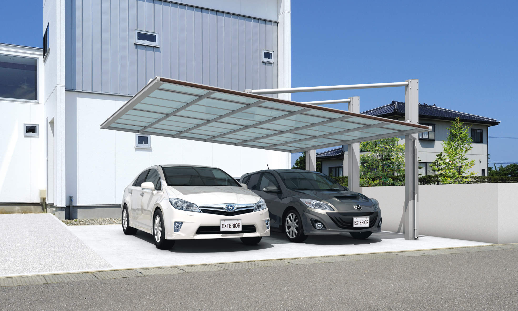 3本の強靱な柱とアームで屋根をしっかり支える上吊りタイプでダイナミックなデザインが魅力です。 2台駐車に対応するワイドタイプで片側支持を実現。側面支持または背面支持で、開放感があり見通しも良く車の出し入れがしやすくなります。