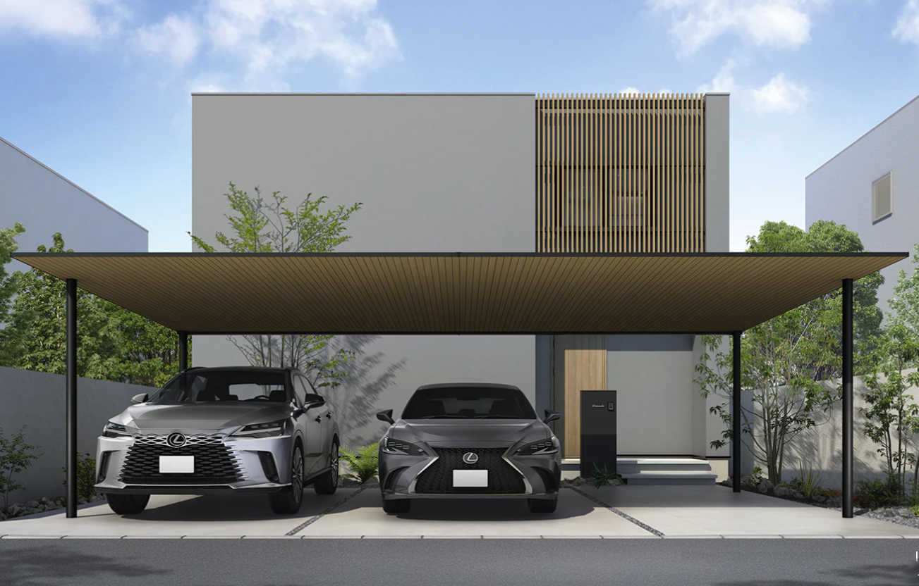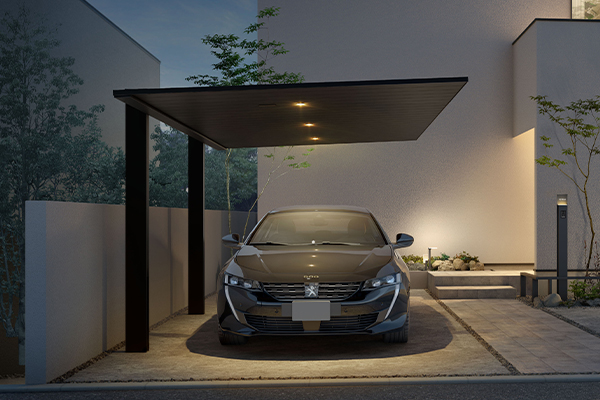 また軒下をシームレスに繋ぐことのできる「間口連結納まり」や、2台用・3台用では軽やかな印象の「丸柱仕様」も選べ、細部へのこだわりにお応えします。