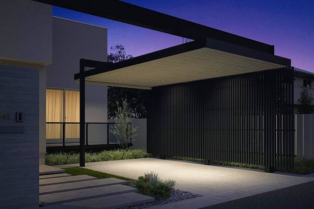 業界初 間口12mのフレームがファサードに圧倒的な存在感を与えるカーポート、三協アルミのU-style ADEXT(ユースタイルアゼスト)
