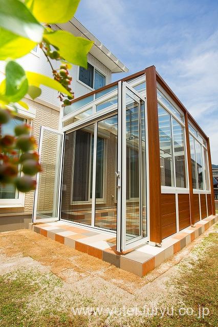 > ガーデンルームハピーナとカラフルなタイルテラス