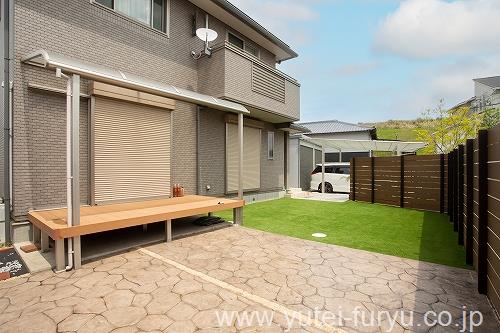 既存テラス・ウッドデッキ前の舗装:スタンプコンクリート・人工芝
