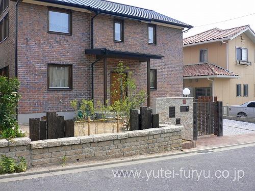 家が赤系の総レンガタイルでしたので、濃い色のコンクリート製の枕木を立込み、家とかけ離れないようにしました。